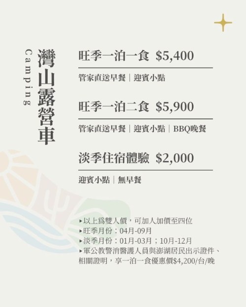 - 軍公教警消醫護人員與澎湖居民提供相關證件或證明,享一泊一食4,200元優惠價,請於預訂時主動告知。