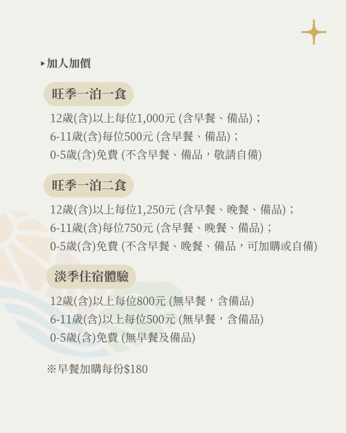 - 價目表為雙人入住價格,加人加價另計。(加床為雙人沙發床)